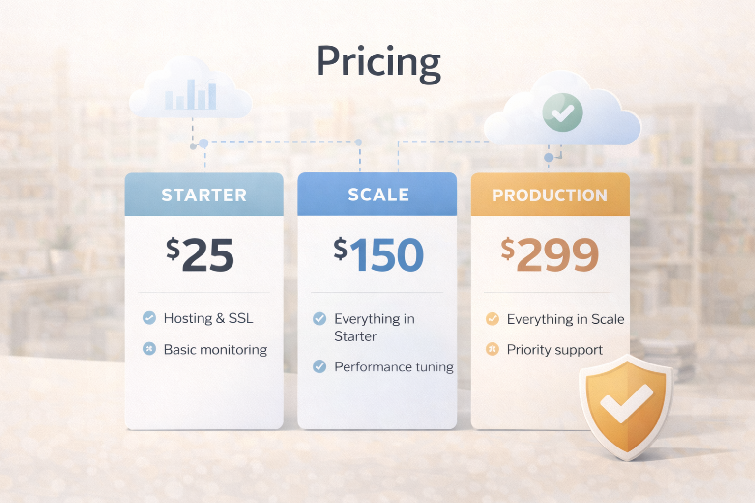 Two models: pay-as-you-go engineering support, and monthly managed hosting. Mix and match based on what your app needs.